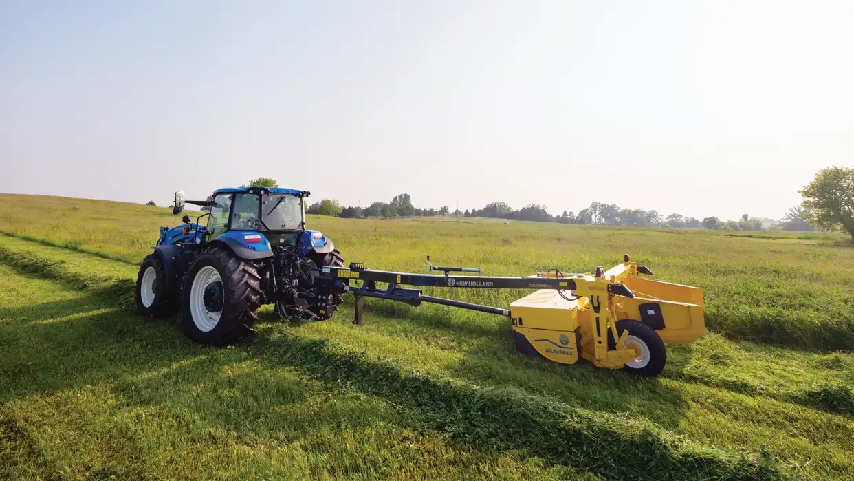 Les attelages standard des modèles Discbine® 209 et 210 de New Holland se fixent rapidement avec une goupille d’attelage classique, un arbre de prise de force, un connecteur d’éclairage et toujours deux télécommandes. Aucune rallonge compliquée n’est nécessaire. On fait le foin quand il fait beau, alors préparez-vous et commencez à faucher.